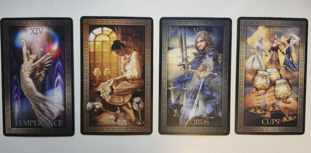 Action, 5 of Swords. Swords is the element of Air in the realm of mind, thoughts, attitudes, beliefs, and communication. Again, five is a point of challenge. This week, use wisdom gained through experience to evaluate limitations, options, and where best to apply your energies for your creative work. Choose which battles are worth your time and effort, and which ones only steal time and energy from your creative work. You can’t be everywhere and you can’t win all the time. Pick and choose, and, as Temperance suggests, keep your balance.