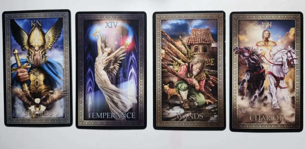 Gift, The Chariot. This Major Arcana card offers you and your creative project success when you follow through with the Knight of Swords, Temperance, and the Ten of Wands. And the success may bring travel. Be ready for your success and the gifts and demands that come with it.