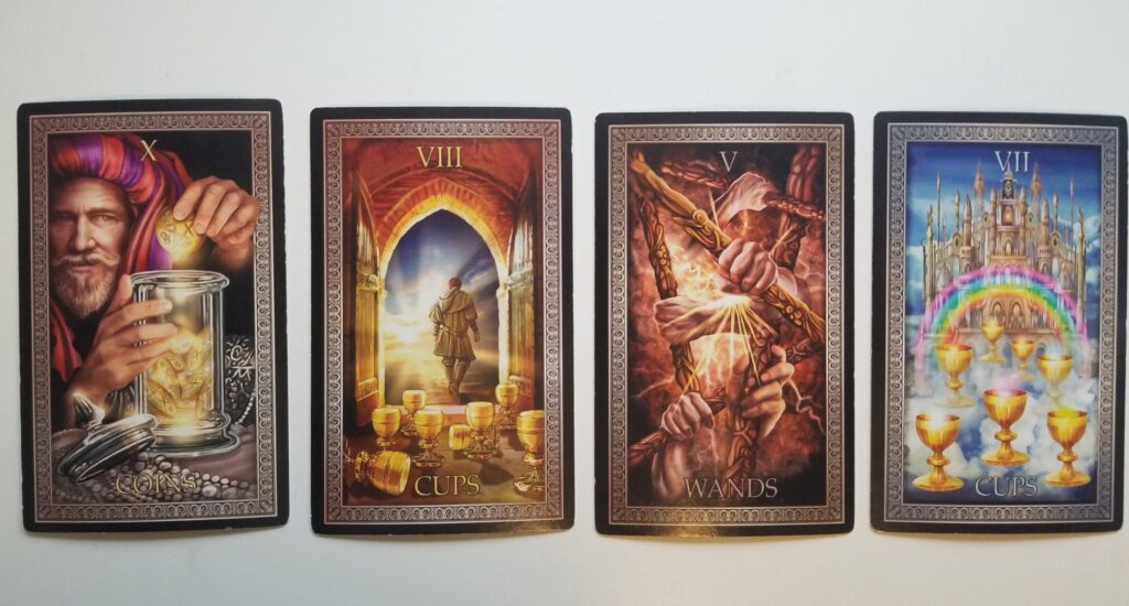 Theme, 10 of Coins. Coins is the element of Earth in the realm of home, health, wealth, or anything physical. Ten is a number between completion and beginning again, and an intensity or abundance of the suit. After all the hard work and persistence, your creative diligence brings rewards. The accumulation of completed work–pages, notes, canvases, etc.–allows opportunities for recognition, sales, and personal satisfaction. Don’t forget to honor your Muse and the beauty of the world around you in gratitude.