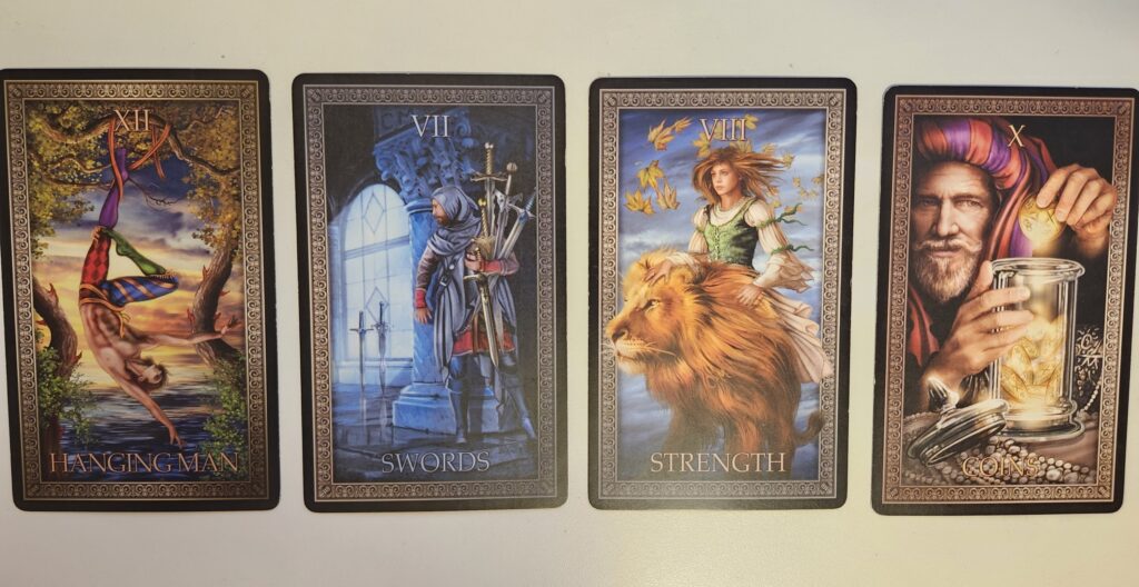 Action, Strength. This Major Arcana card with the strong, yet peaceful lion urges you to recognize your incredible fortitude and the inner strength that has taken you this far in your creative work. Recognize that you might be stronger than you’ve given yourself credit for, and therefore, you are ready and able to tackle a project that arises from your new perspective and insights. Trust yourself and your abilities.