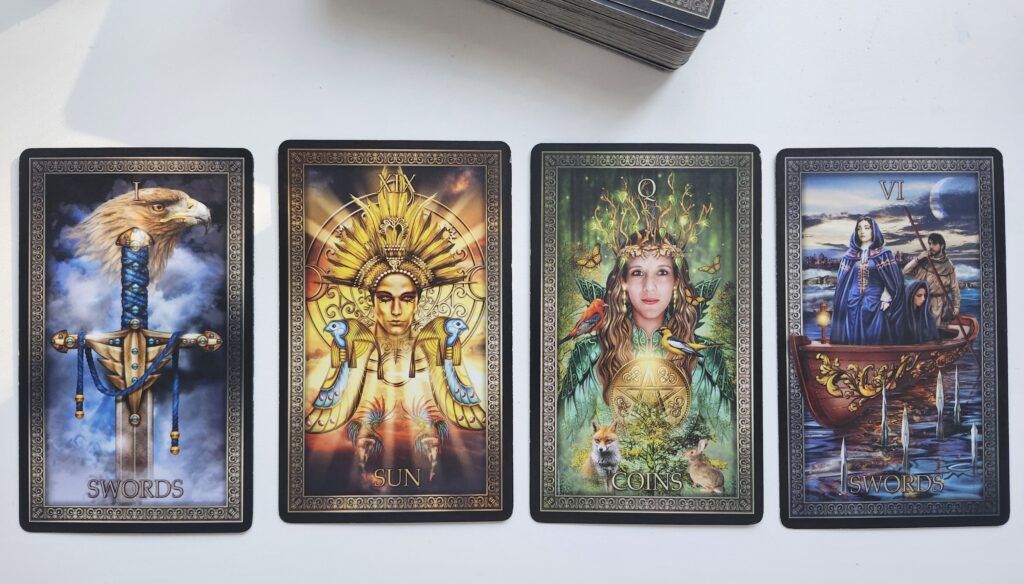 Gift, 6 of Swords. Swords again, beginning and ending this week’s message. The Six in the tarot is a number of generosity and harmony. Here, the boatman generously supports their passengers on their journey into the future. Your role is to stay focused on the gifts that come your way for your creative work, rather than the doubts and fears that might vie for your attention. Stay clear and focused on your creative goals, and support will be there.