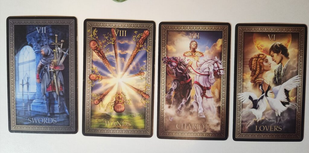 Action, The Chariot. This Major Arcana card is very much about determination, movement, excitement, and success with speed. It challenges you to commit to the new creative adventure, and to be diligent and persistent in your journey. The best way to experience the ride is to maintain focus and balance. Know what your desired destination is and stay on track to it.
