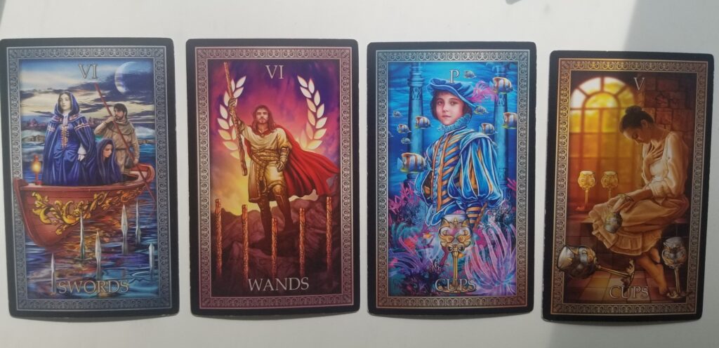 Theme, 6 of Swords. Swords is the element of Air in the realm of mind, thoughts, attitudes, beliefs, and communication. Six is a number of relationships and harmony. Here, there are three relationships with the Swords. The boatman uses them as markers of a pathway for the boat. The figure on the boat focuses on the peril of the Swords. The woman at the prow is focused on the far shore, looking forward to the outcome of the journey. This week, instead of focusing on how things won’t work, or figuring out your creative path in detail, focus instead on positive outcomes for your creative work. Discern where you want to land with your creative work and who will help you get there.