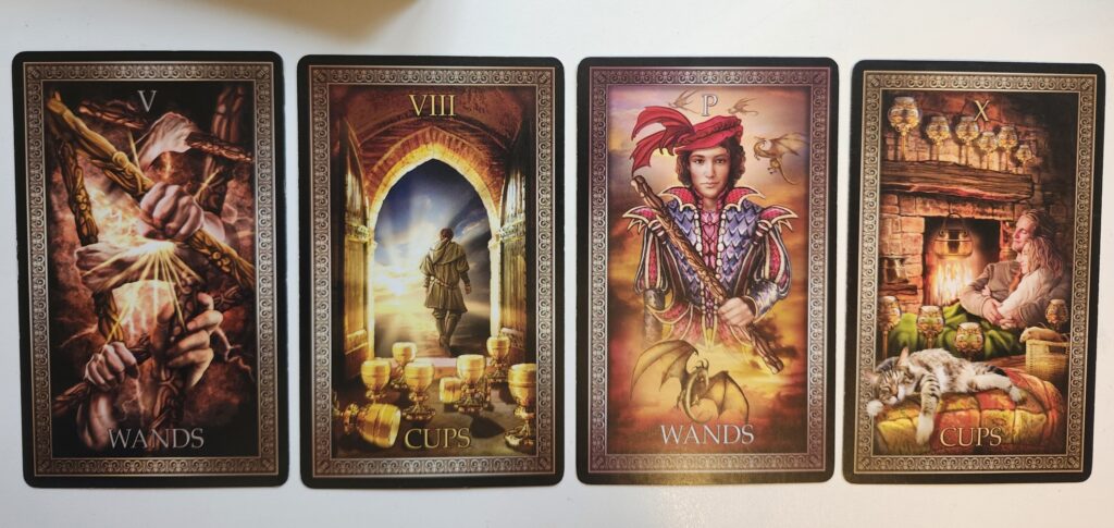 Focus, 8 of Cups. Cups is the element of Water in the realm of heart, emotion, dreams, intuition, and creativity. Eight is a number of momentum. If you want to keep moving forward in your creative field, are you ready to leave behind what is no longer viable or emotionally or creatively fulfilling for you? If the Cups are empty or no longer satisfying, then isn’t it time to seek new creative worlds? Yes, the known is comfortable even when unsatisfying, but do you dare to take on the unknown and see what you might discover about yourself and your work?