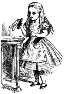 falls down the rabbit hole she discovers a doorway that opens into a lovely garden but the doorway is less than a foot high? And Alice can’t fit through it—-until she discovers a bottle that says “Drink me”, which she does, shrinking herself to only ten inches high.