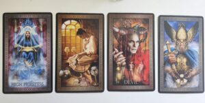 Action, Devil. Another Major Arcana card, and this urges you, in light of your dreams and the messages from your Muse, to be honest with yourself about what you are allowing to hold you back from manifesting your creative work. Forgive yourself for past failures and find the freedom to play and create. The Devil can ignite your creative passions and help fuel vision.